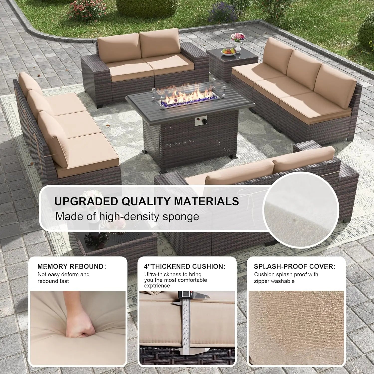 13 Pieces Outdoor Patio Furniture Set with 43" 55000BTU Gas Propane Fire Pit Table PE Wicker Rattan Sectional Sofa Patio