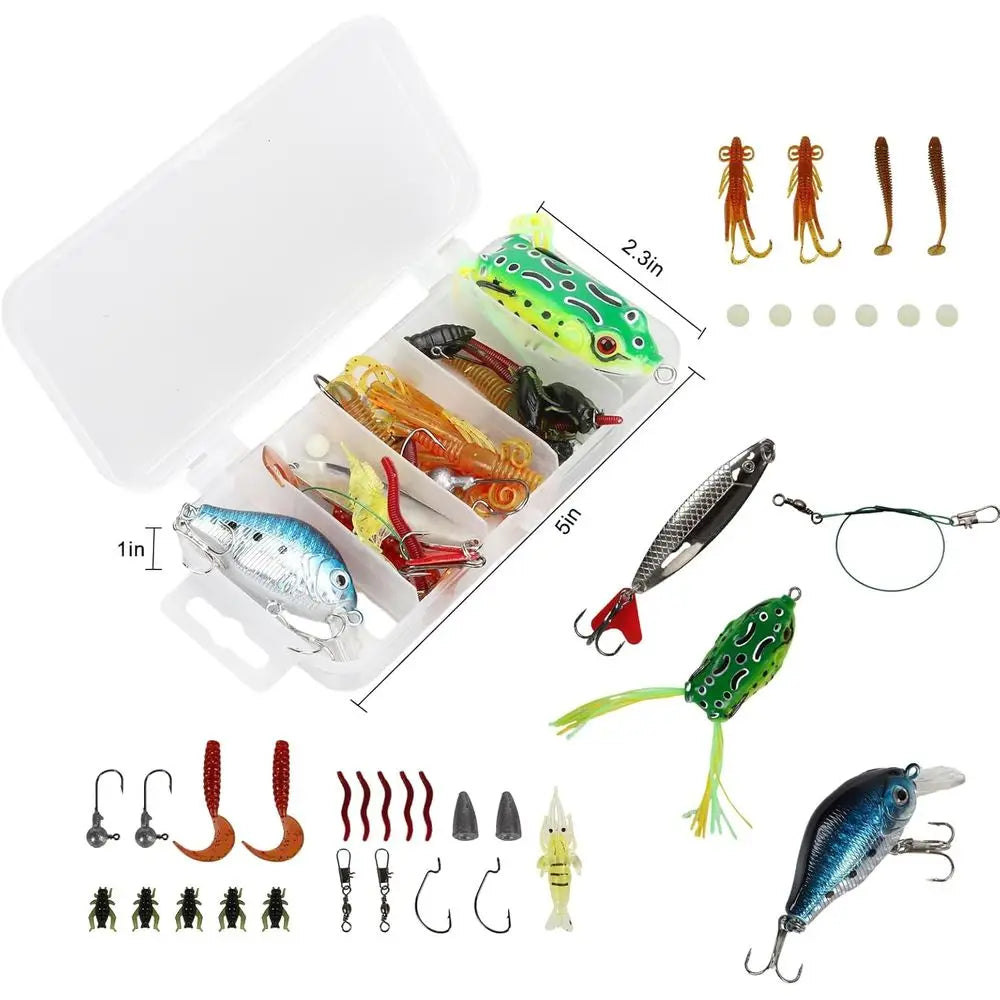 **Fully Loaded Tackle Box**: This 35-piece fishing bait set includes a comprehensive range of items: 1 frog lure, 1 crankbait VIB, 1 spoon lure, 6 earthworms, 2 curved tail grubs, 2 paddle tail swimbaits, 2 rolling swivel snaps, 2 barrel snap swivels, 2 offset hooks, 2 tube jigs, 5 fishing beads, 3 shrimp, and 5 crickets.