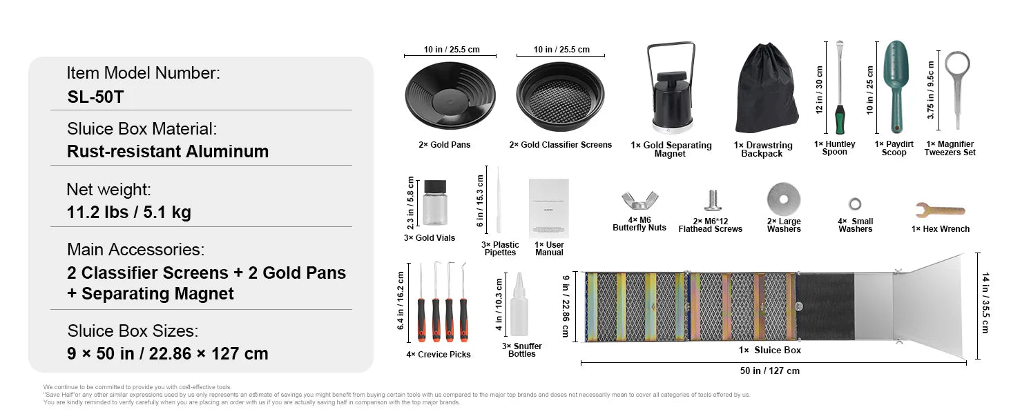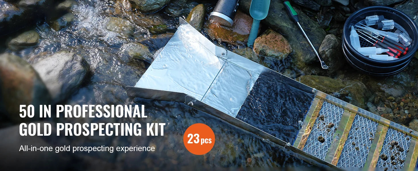 50-inch Gold Prospecting Kit: Our 23-piece gold panning kit includes everything you need, including 2 gold pans, 1 sluice box, 2 gold classifier screens, 1 gold separating magnet, 3 snuffer bottles, 3 plastic pipettes, 3 gold vials, 1 paydirt scoop, 1 spoon, 1 magnifier tweezers set, 4 crevice picks, and 1 drawstring backpack.