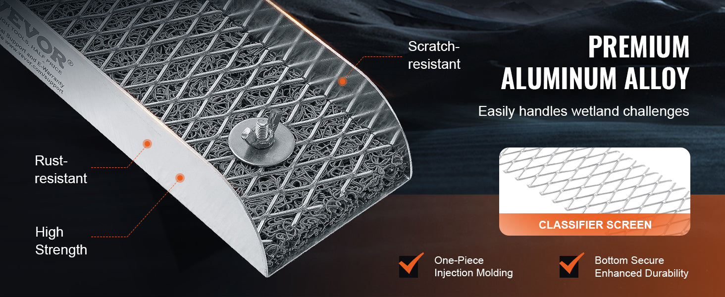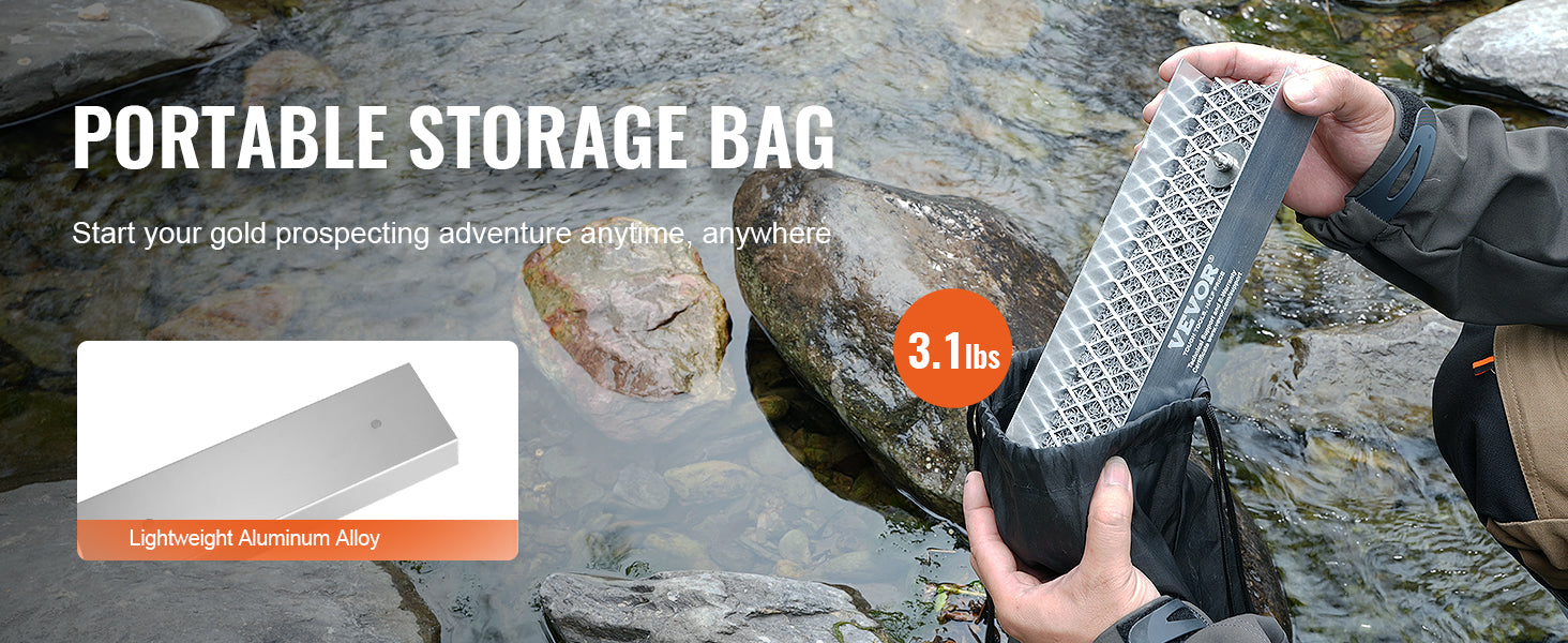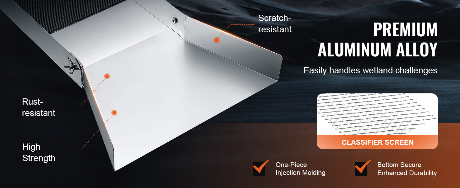 Premium Aluminum Alloy: The sluice box is constructed from lightweight yet sturdy aluminum alloy, making it easy to carry in the field and resistant to harsh outdoor conditions. Its excellent rust resistance ensures long-term use even in moist conditions, maintaining durability. Superior scratch resistance and durability make it the ideal choice for gold prospectors.