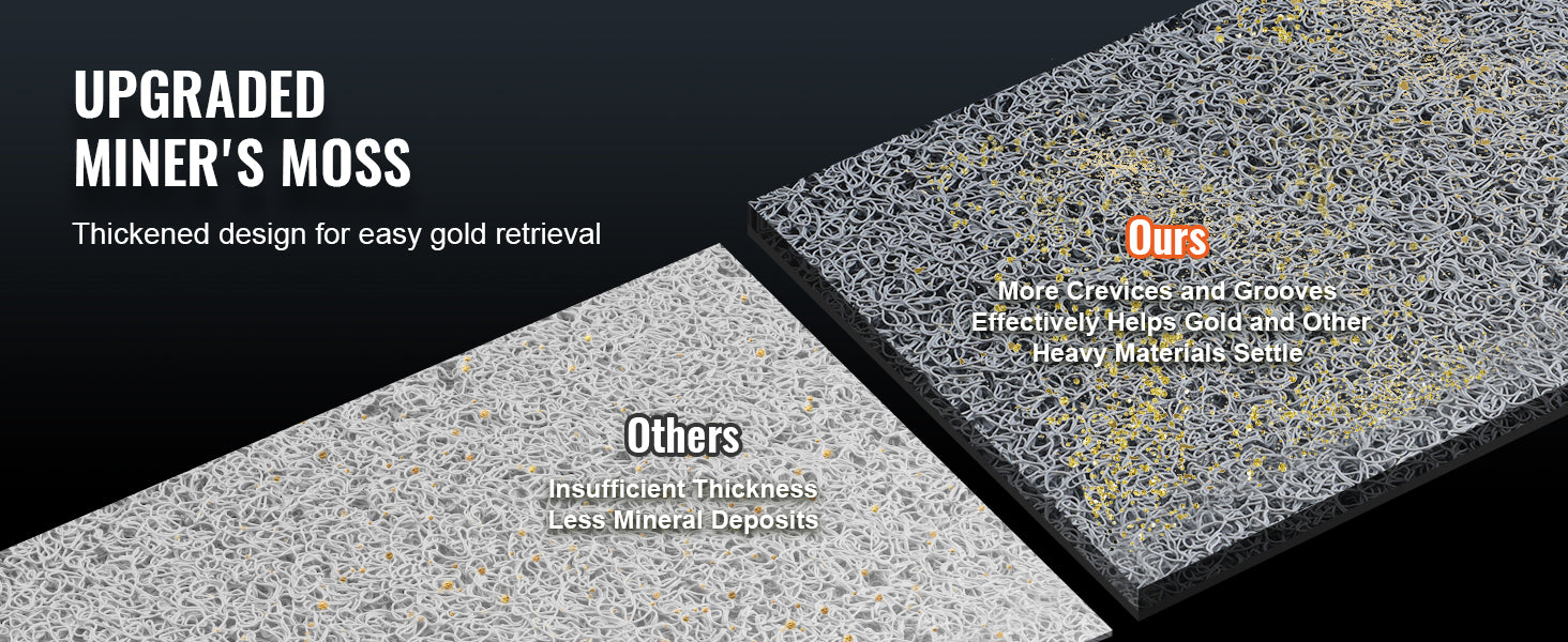 Efficient Gold Recovery: The thickened miner's moss features more crevices and grooves, making it easier for gold particles and other heavy materials to settle on the mat. The gold mining kit effectively washes away light sand and worthless impurities, saving time and resources and allowing you to focus more on valuable gold.