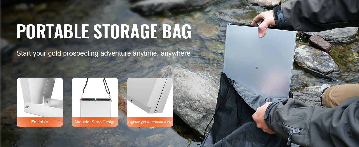 Lightweight and Portable: The gold sluice kit comes with a storage bag, allowing you to easily carry it wherever you go, whether deep into the wilderness, across rivers, or up mountains. The foldable sluice box, equipped with shoulder straps, facilitates mobility while preventing accidental sliding or tilting, enhancing operational safety.