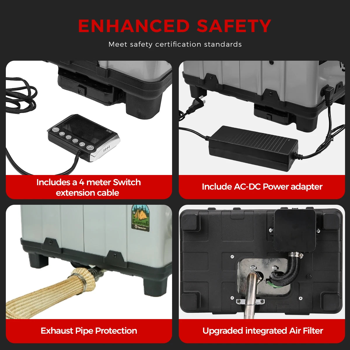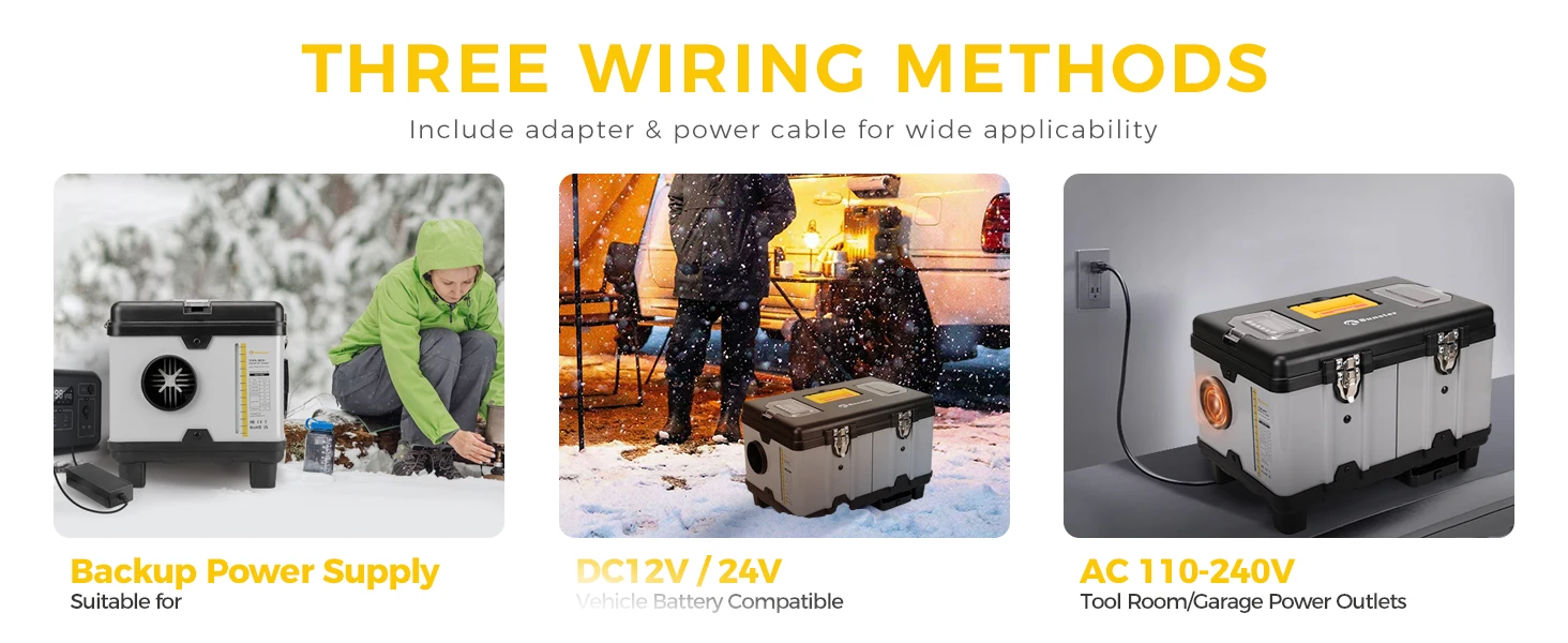 Comprehensive safety features:Engineered with multiple safety protections,including over-heating,short-circuit, reverse connection,and over-voltage safeguards, this portable diesel heater ensures safeand reliable operation in any environment.