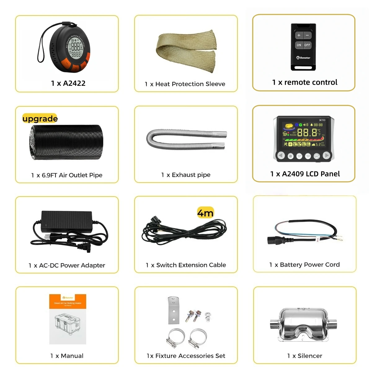 Packaged included:1 xAir Diesel Heater,1 xRemote control,1 xAC110-240V power adapter,1xSilencer、1 x Exhaust pipe,1X Flexible and stretchable Air Outlet Pipe ,1 Xset Screw accessory kit,1 xUser manual,1 x DC batterypower cable,1xHeat protection sleeve,1x4m Switch extension cable