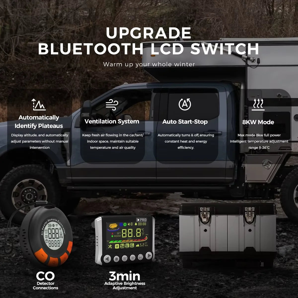 Innovative CO Alarm System: Our diesel heater features enhanced safety with a built-in CO alarm that continuously monitors CO levels, providing alerts or auto shut-off when needed. Additional upgrades include a leak-proof fuel tank cap, fuel level indicator, and overheat protection—ensuring peace of mind during extended use.he risk of carbon monoxide poisoning.