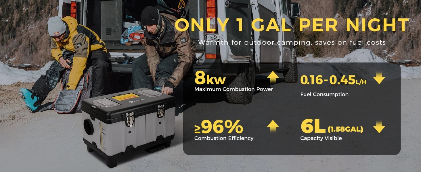 Low Fuel Consumption:Our diesel heater has a power of 8kw with a heating efficiency of ≥90%. It consumes only 1 GAL of diesel per night to keep a large area of 215ft²/20㎡ continuously warm.
